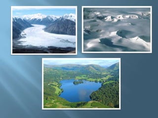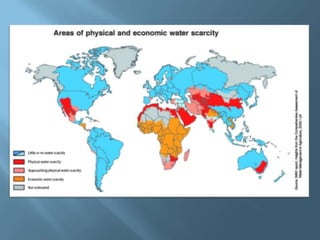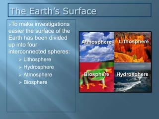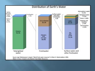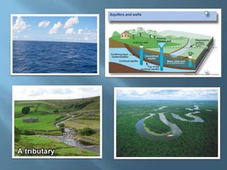 The document explains the four interconnected spheres of the Earth: lithosphere, hydrosphere, atmosphere, and biosphere, focusing on the hydrosphere, which encompasses all water on Earth. It discusses the water cycle, types of water (saltwater and freshwater), and various water bodies such as rivers, lakes, and glaciers, as well as the importance of water for life and its uneven distribution. Additionally, it mentions environmental issues like floods and droughts, emphasizing the necessity for water recycling.