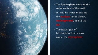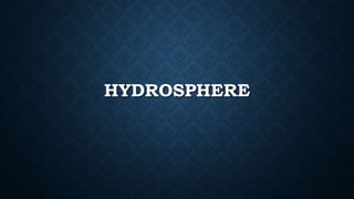 The document discusses the hydrosphere and the distribution of water on Earth. It describes the water cycle by which water evaporates from oceans and transpiration from plants, condenses to form clouds, and precipitates as rain or snow back to Earth's surface and subsurface. It outlines the major types of water found on Earth's surface, including streams, rivers, lakes, swamps, marshes, and underground water, as well as Earth's ice and oceans which hold the vast majority of the planet's water supply.