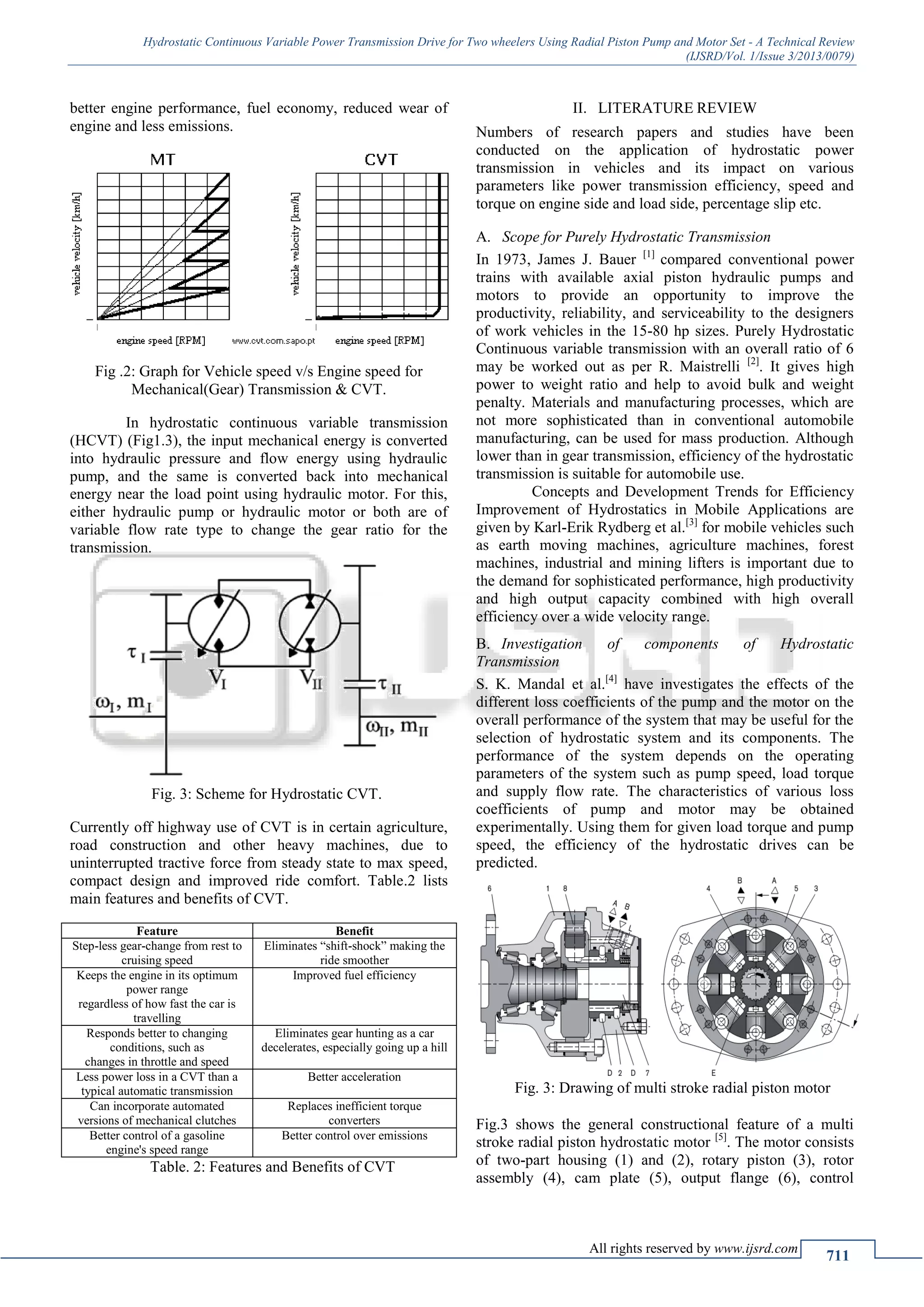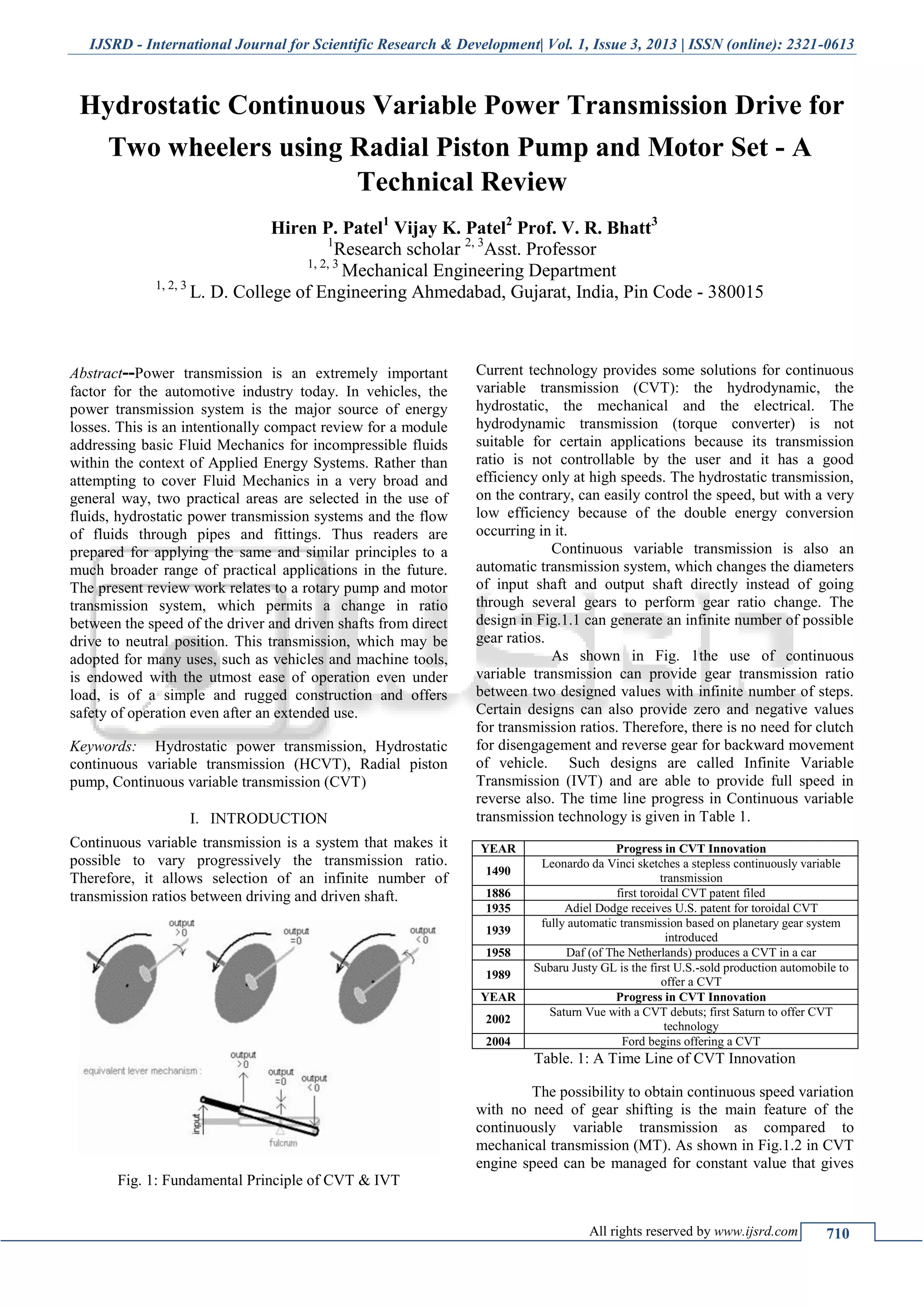 The document reviews the hydrostatic continuous variable power transmission (HCVT) systems for two-wheelers using radial piston pumps and motors, highlighting their efficiency and operational benefits in automotive and heavy machinery applications. It discusses the evolution of continuous variable transmission technology, emphasizing the advantages of HCVT such as smooth operation, improved fuel efficiency, and reduced need for gear shifting. The analysis of relevant literature and patents underscores the relevance of hydrostatic transmission in enhancing the performance of vehicles in various operational contexts.