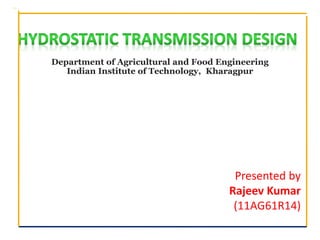 2. Key components of hydrostatic transmissions are described, including the charge pump, relief valves, motors, and pumps. The selection process for pumps and motors is also outlined.