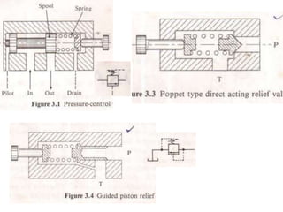 3. Various pressure control valves used in hydrostatic systems are explained, such as relief valves, counterbalance valves, sequence valves, and pressure reducing valves. Shuttle valves are also introduced.