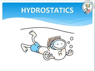This document provides an overview of hydrostatics and the concepts of total pressure, center of pressure, and hydrostatic force on immersed surfaces. It discusses the total pressure on horizontally, vertically, and inclined immersed surfaces. It describes how to calculate the center of pressure on vertically and inclined immersed surfaces. The document also discusses hydrostatic force on curved surfaces and some applications of hydrostatics, such as water pressure on sluice gates.