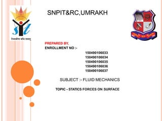 This document discusses fluid statics and hydrostatic forces. It defines key terms like resultant force, center of pressure, and explains how to calculate them for surfaces with non-uniform pressure distributions. Specific examples are given for calculating the resultant force and center of pressure on a submerged rectangular plate and for curved surfaces. Forces on a cylindrical gate hinged at one end are also analyzed.