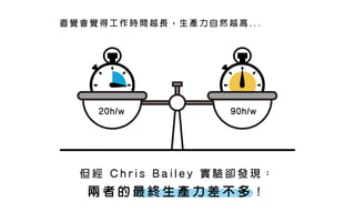 h r i s B a i l e y 實 驗 卻 發 現 : 兩 者 的 最 終 生 產 力 差 不 多 ! 20h/w 90h/w 直 覺 會 覺 得 工 作 時 間 越 長 , 生 產 力 自 然 越 高 . . .