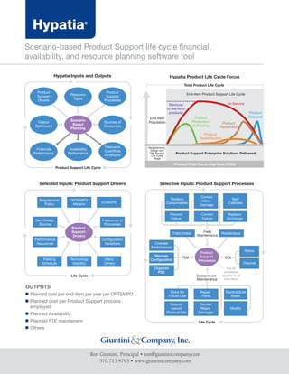 The document describes a scenario-based product support life cycle financial, availability, and resource planning software tool called Hypatia. It reduces the time needed to perform analytics and delivers accurate outputs without requiring large amounts of data. It provides the elements needed for product support business case analysis, market studies, and budgeting. The tool enables rapid identification of elements that impact total ownership cost and provides "what-if" capabilities to analyze life cycle costs, availability, and resource requirements. It is transitioning from an Excel workbook to a web-hosted SQL server product.