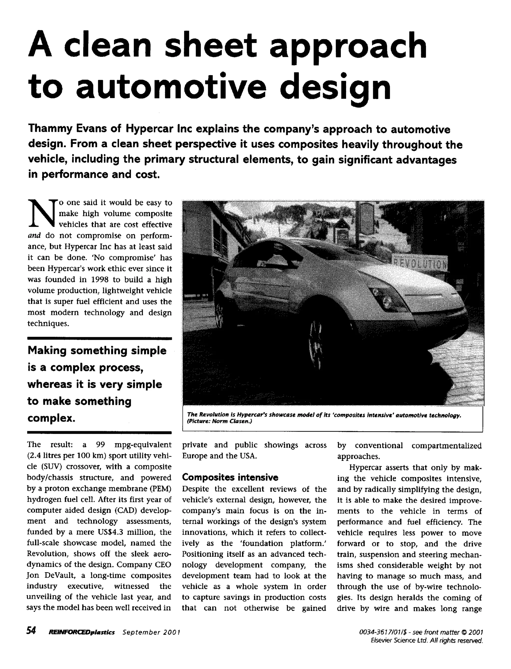 Hypercar Inc is developing a lightweight, high-volume production vehicle using composites for structural elements to gain advantages in performance and cost. Their showcase vehicle, the Revolution SUV, achieves 99 mpg equivalence using a composite body/chassis structure and hydrogen fuel cell. Their clean sheet approach and composites-intensive design has simplified production processes to make the vehicle affordable while meeting requirements for safety, efficiency, and emissions.