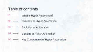 Hyper automation integrates robotic process automation (RPA), artificial intelligence (AI), machine learning (ML), and natural language processing (NLP) to automate both routine tasks and complex decision-making processes, significantly enhancing efficiency and accuracy. It offers numerous benefits, including cost savings, improved productivity, and enhanced customer experiences, while also presenting challenges such as job displacement and ethical considerations. Future trends in hyper automation include advancements like quantum computing, edge computing, and the emergence of hyper automation as a service.