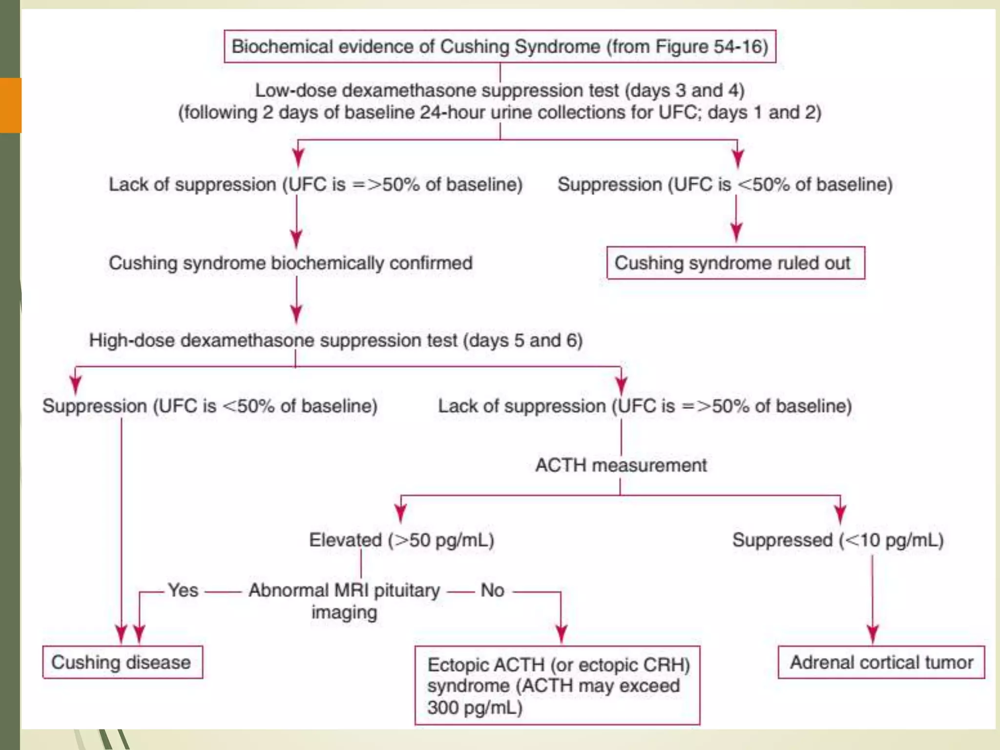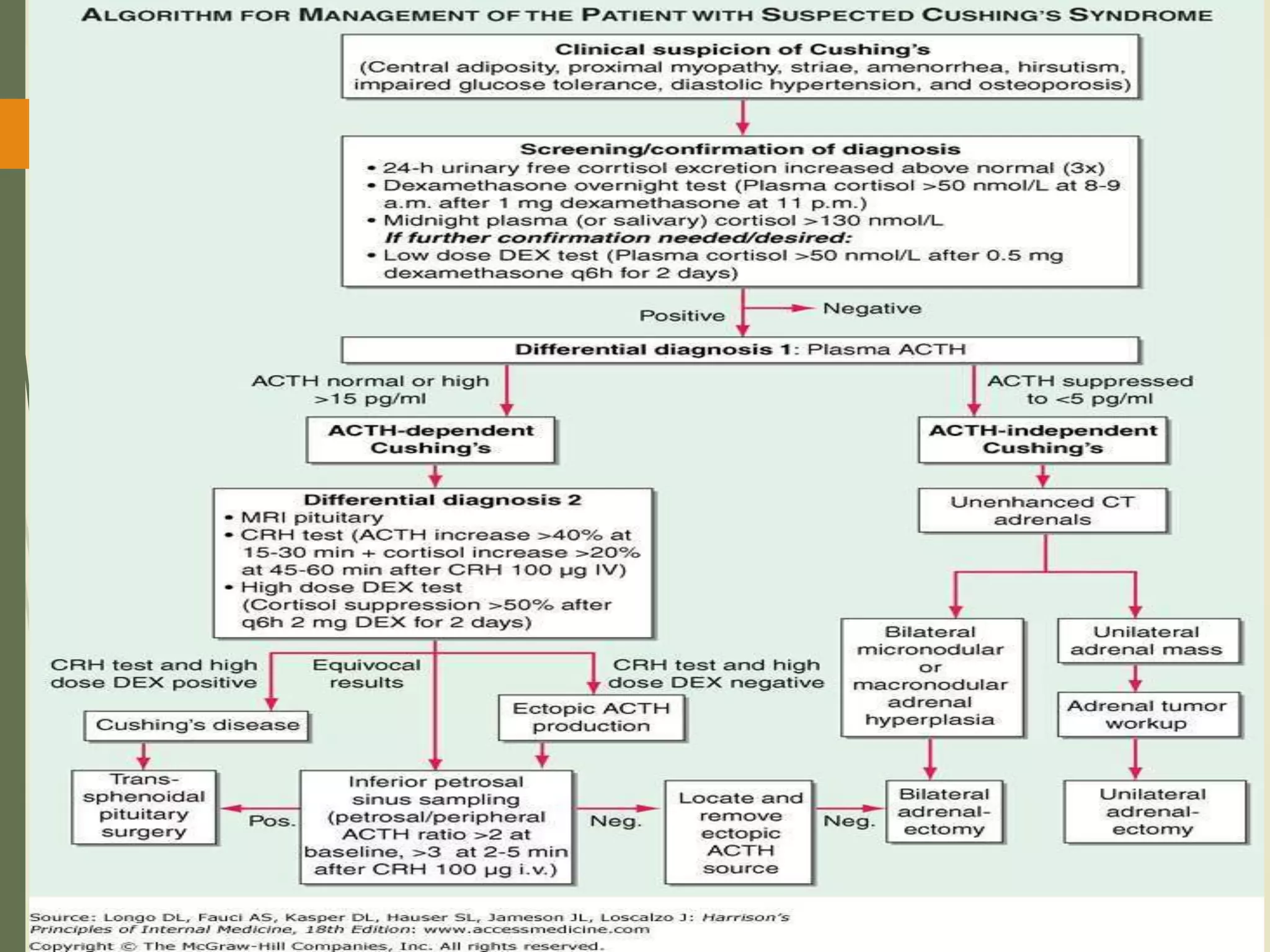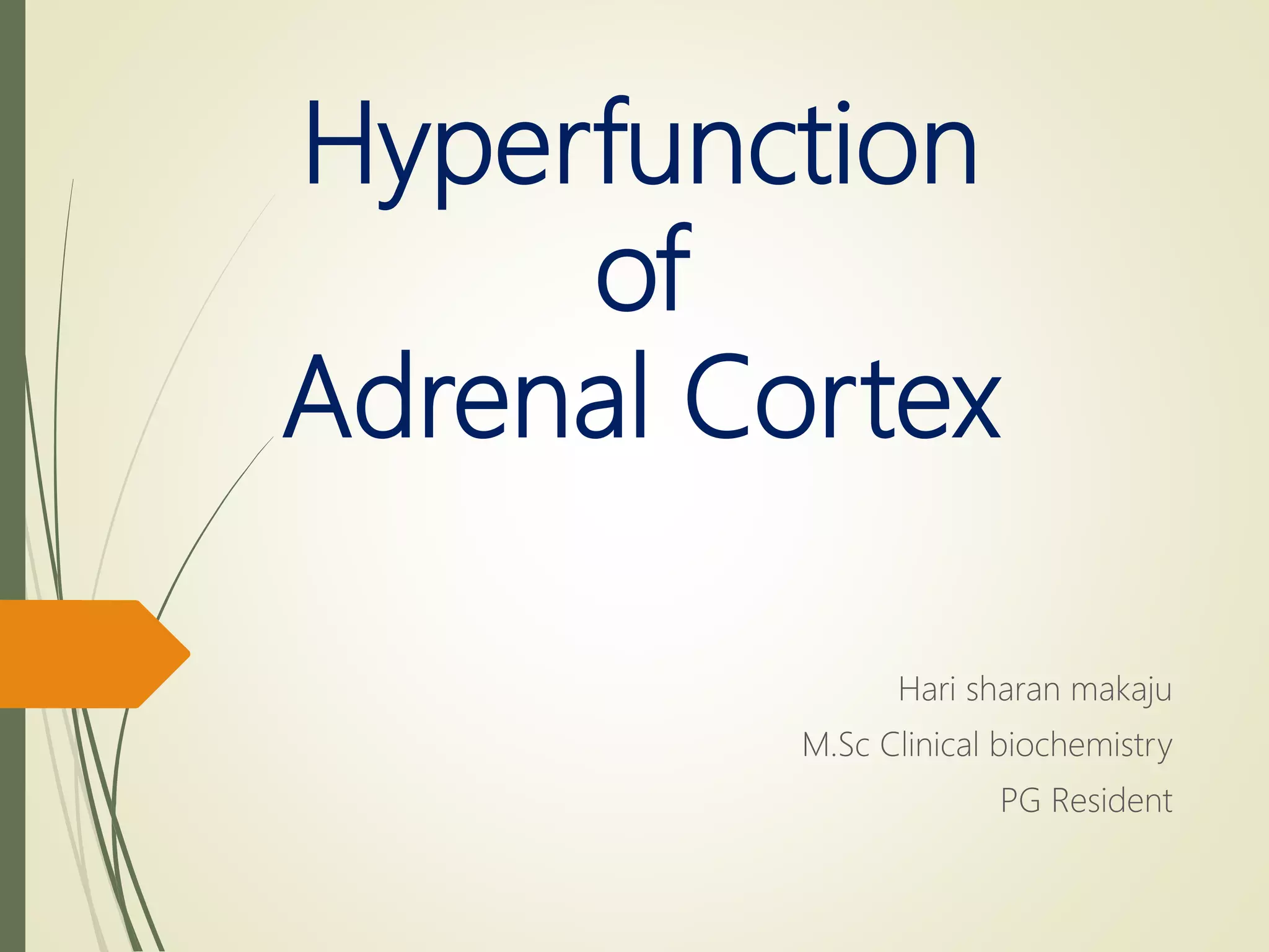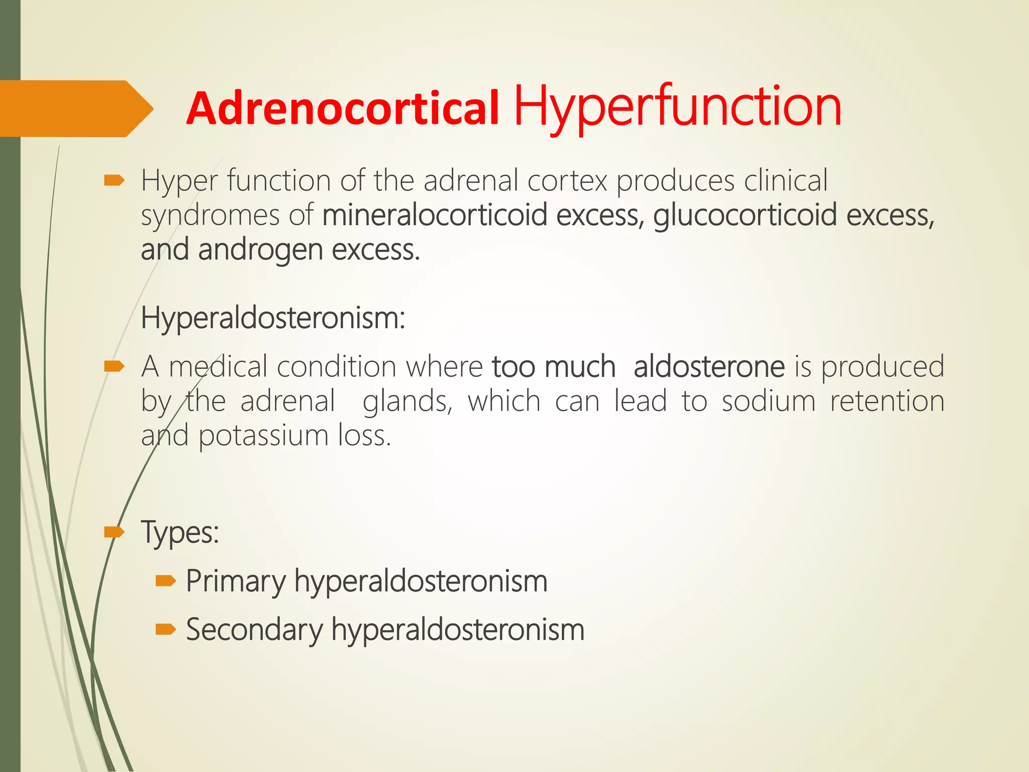 Hyperfunction of the adrenal cortex can cause excess production of mineralocorticoids, glucocorticoids, or androgens. Primary hyperaldosteronism is characterized by autonomous overproduction of aldosterone by the adrenal glands, often leading to hypertension and hypokalemic alkalosis. It can be caused by aldosterone-producing adenomas or bilateral adrenal hyperplasia. Tests like the saline suppression test and adrenal vein sampling are used in the diagnosis. Cushing's syndrome results from prolonged exposure to high levels of cortisol and can be caused by pituitary or adrenal tumors or ectopic ACTH secretion. Signs include central obesity, moon face, and fragile skin