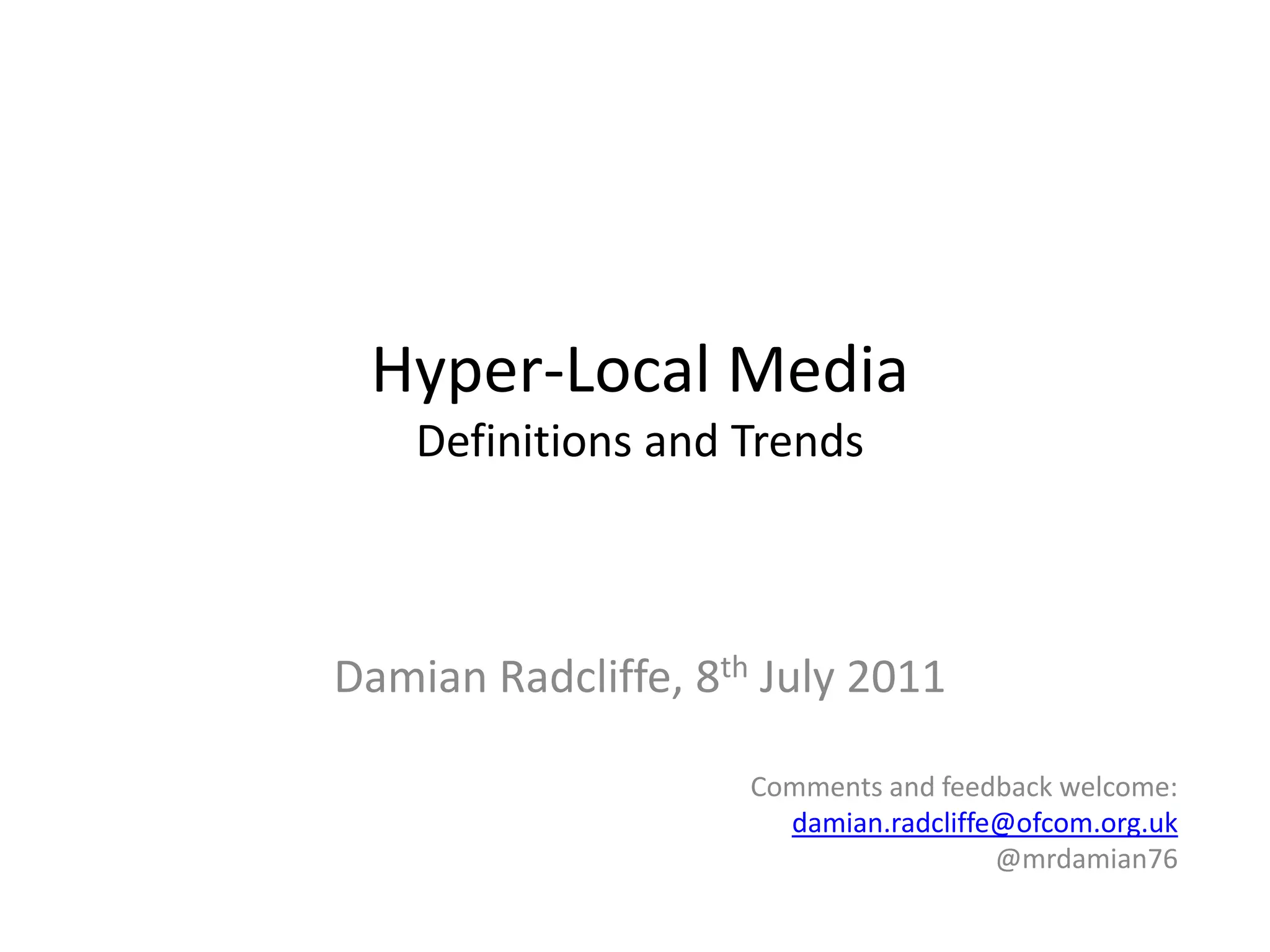 Hyper-local media is growing in importance as consumption of local media changes with more use of the web. There is no single definition of hyper-local but it generally refers to media at a smaller geographical scale than traditional outlets, often seeking to serve local audiences in ways larger outlets do not. Key issues for hyper-local media include finding a proven business model, the rise of location-based and hyper-local advertising, and assessing the true size of local audiences.