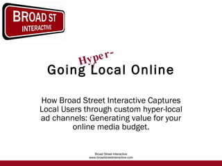 Broad Street Interactive focuses on capturing local audiences through custom hyper-local advertising channels, emphasizing the growing preference for online news over traditional media. The document highlights research showing that a significant portion of the population now prefers the internet for news and weather, particularly among more educated demographics. By partnering with local media and utilizing targeted strategies, Broad Street Interactive aims to enhance ad relevance and engagement for its clients.