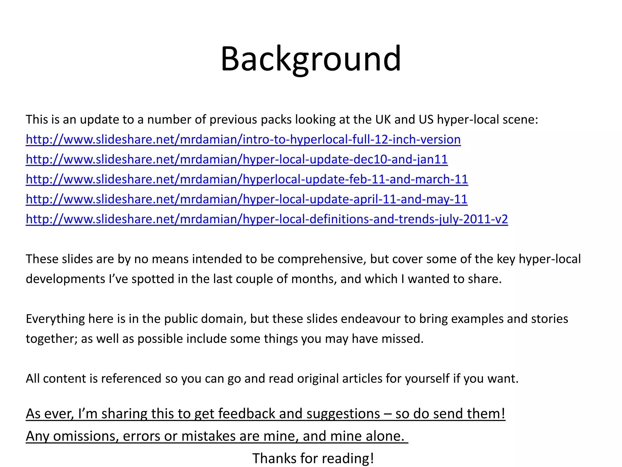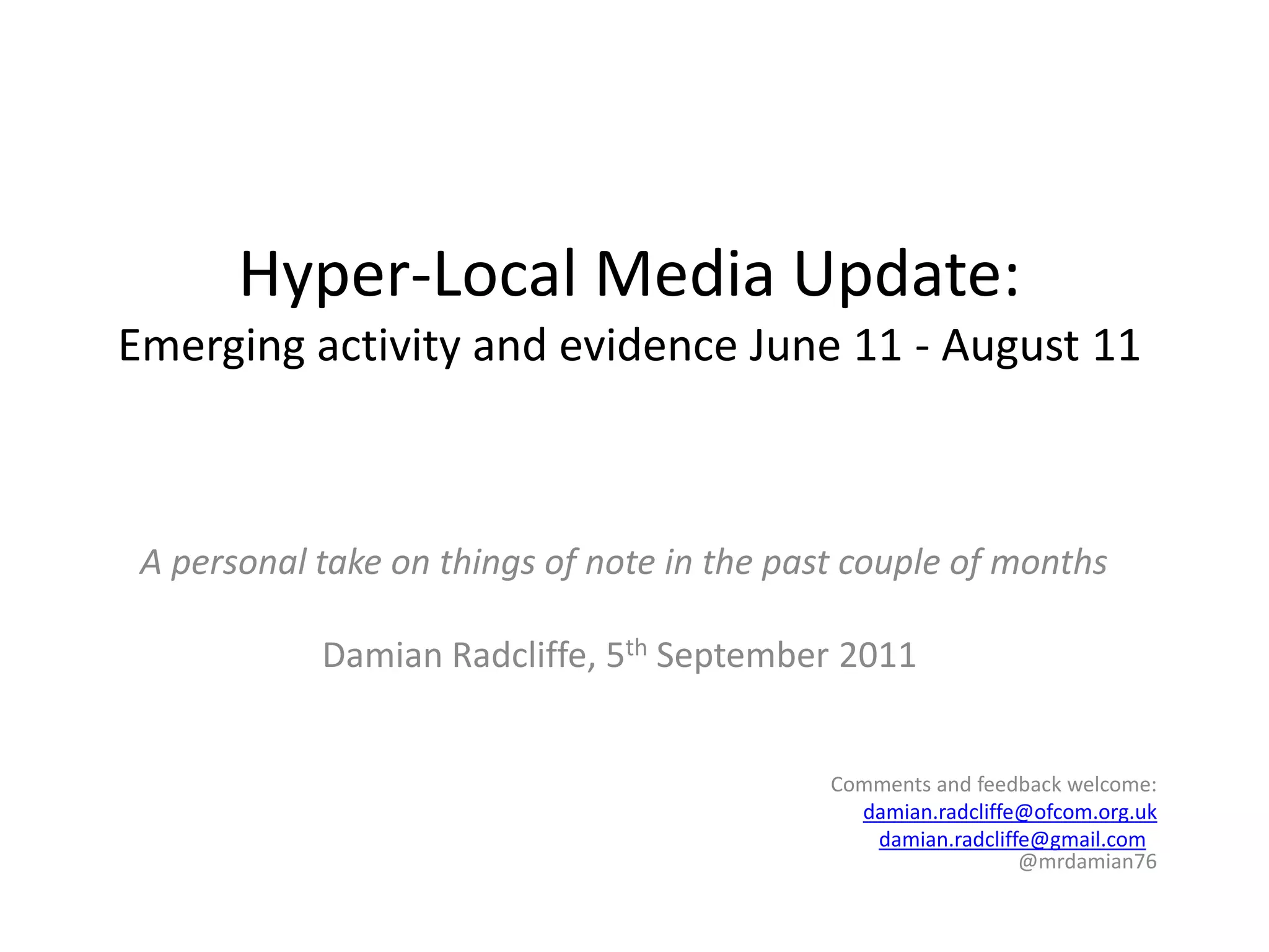 This document provides an overview of recent developments in the UK and US hyper-local media scene from June to August 2011, highlighting key initiatives and updates such as the proposed creation of local TV services with government support, successful online engagement during riots, and the transformation of newspaper business models. It emphasizes the importance of local media in fostering community connections and accountability. The document also includes insights into legal rulings affecting online content, new business strategies for media firms, and the emergence of hyper-local news platforms.