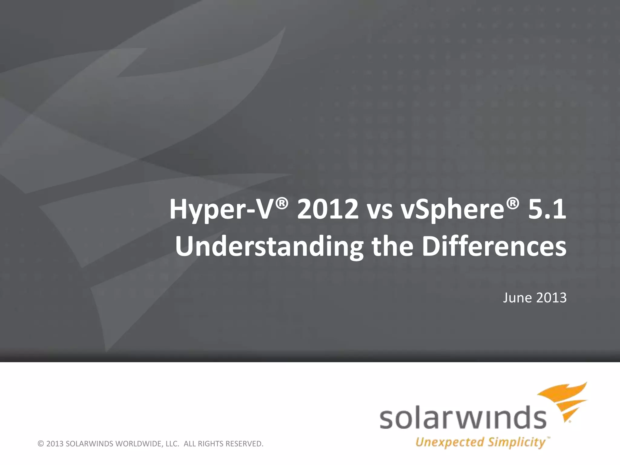 The document compares Hyper-V 2012 with vSphere 5.1, highlighting key features and differences in hypervisor types, resource management, and storage capabilities. While VMware vSphere maintains a lead in certain areas, Hyper-V 2012 has significantly closed the gap with new functionalities and improved performance. The discussion covers various aspects, including CPU scheduling, memory handling, networking, workload migrations, and cost considerations for organizations considering virtualization solutions.