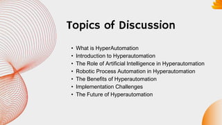 Hyperautomation aims to automate as many processes as possible within an organization. It utilizes technologies like robotic process automation and artificial intelligence to automate repetitive tasks previously done by humans. This allows organizations to improve efficiency, reduce costs, increase productivity and gain a competitive advantage. Some challenges of implementing hyperautomation include finding skilled workers and integrating different technologies, but the future is promising as more advanced technologies get incorporated.