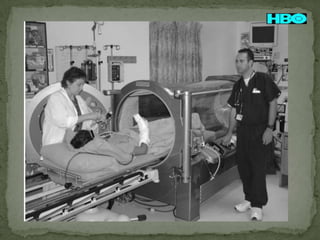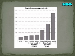 This document discusses the history, basics, indications, contraindications, complications, and applications of hyperbaric oxygen therapy (HBOT). It begins with definitions and the initial discovery of HBOT in the 1600s. It then covers the physics and physiology behind how increased pressure and oxygen concentration improves oxygen delivery to tissues. Common indications for HBOT include carbon monoxide poisoning, decompression sickness, gas embolism, and infections like clostridial myonecrosis. Complications can include barotrauma, seizures from oxygen toxicity, and fire hazards. Applications of HBOT include wound