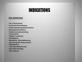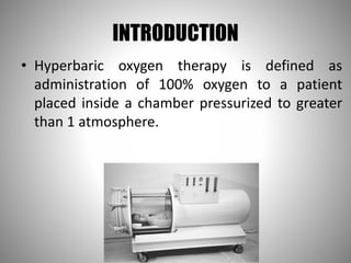1. Hyperbaric oxygen therapy involves delivering 100% oxygen to a patient in a pressurized chamber at greater than 1 atmosphere to increase the amount of oxygen dissolved in the patient's plasma.