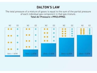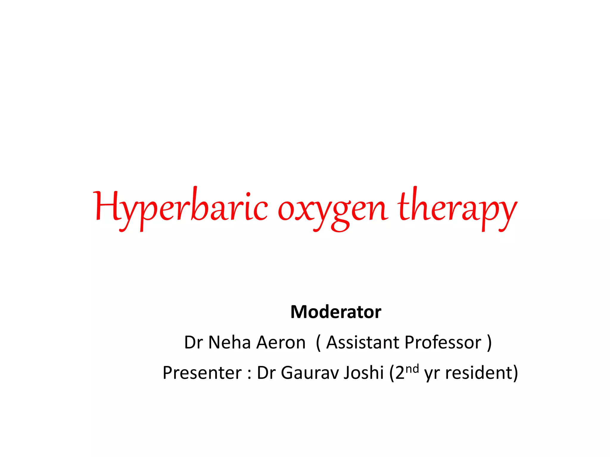 Hyperbaric oxygen therapy (HBOT) involves breathing 100% oxygen inside a pressurized chamber above 1 atmosphere. This increases the amount of oxygen dissolved in the blood and tissues. HBOT is used to treat conditions like carbon monoxide poisoning, gas embolism, necrotizing soft tissue infections, and radiation injuries by increasing oxygen delivery to compromised tissues. It works by increasing the partial pressure of oxygen inhaled, allowing more oxygen to enter the bloodstream both bound to hemoglobin and dissolved in plasma. This boosts oxygen levels in tissues to help fight infections and promote healing.