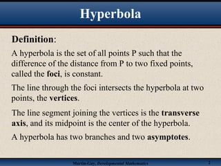 This document discusses hyperbolas. It defines a hyperbola as the set of points where the difference between the distance to two fixed points (the foci) is constant. A hyperbola has two branches and two asymptotes. The asymptotes contain the diagonals of a rectangle centered at the hyperbola's center. The document provides characteristics and equations for translating and graphing horizontal transverse axis hyperbolas. It includes examples of graphing hyperbolas from their standard form equations. Exercises at the end ask the reader to find standard forms and graph hyperbolas given certain properties.