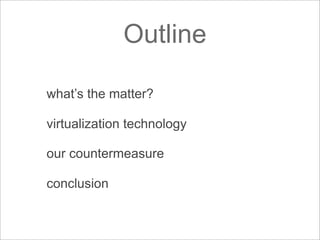 The document presents Hyperforce, a framework for enforcing the secure execution of security-critical code in virtual environments, particularly aimed at mitigating rootkits. It discusses the economic impact of malware and outlines performance metrics showing that Hyperforce allows for trusted monitoring with minimal performance loss. The conclusion suggests the potential for broader applications of this framework to enhance system security further.