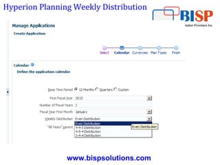 This document provides an overview of weekly distribution in Oracle Hyperion Planning 11.1.2.4 presented by Amit Sharma of BISP Solutions. It includes instructions for forecasting salaries, miscellaneous expenses, and total expenses by setting calculation options, fixing a forecast cell, and using formulas to calculate salaries based on headcount and average salaries and miscellaneous expenses as a percentage of salaries. It concludes by asking if there are any questions.