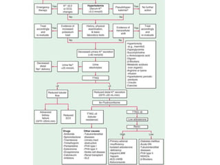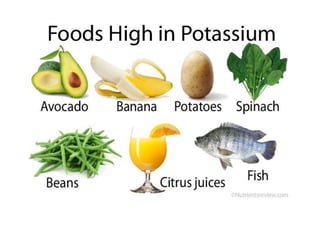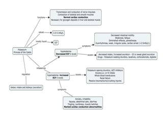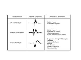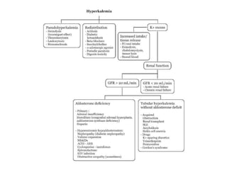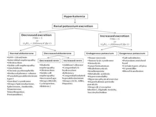 Hyperkalemia can be caused by increased potassium intake, redistribution of potassium from cells into the bloodstream, or decreased excretion of potassium by the kidneys. Clinical manifestations range from weakness to cardiac arrhythmias. Treatment involves membrane stabilization with calcium, shifting potassium into cells with insulin and glucose or sodium bicarbonate, and removing potassium from the body with loop diuretics, potassium-binding resins, or hemodialysis. Glucose should be given with insulin to treat hyperkalemia only if blood sugar is below 175 mg/dL.