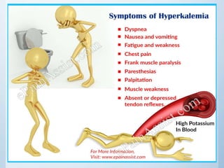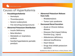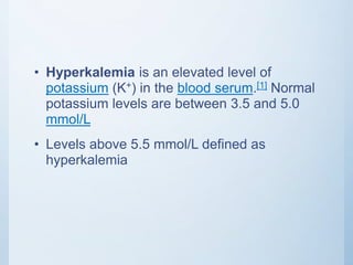 Hyperkalemia is an elevated level of potassium in the blood above 5.5 mmol/L. Initial treatments include calcium gluconate to protect the heart, insulin with glucose to shift potassium into cells, salbutamol to also shift potassium into cells, sodium bicarbonate to treat acidosis, and sodium polystyrene sulphonate to bind potassium in the gut. Definitive treatment is hemodialysis to remove excess potassium from the blood. The emergency management involves determining the cause and using temporary treatments to stabilize the heart and lower potassium through redistribution while arranging hemodialysis if needed for severe cases.