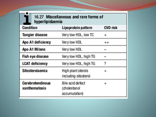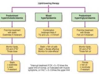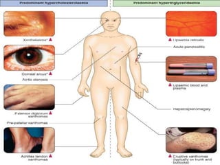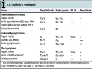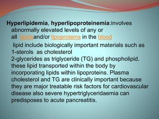 Hyperlipidemia involves abnormally elevated levels of lipids and lipoproteins in the blood. Lipids include cholesterol, triglycerides, and phospholipids, which are transported around the body within lipoproteins like chylomicrons, VLDL, LDL, IDL, and HDL. High cholesterol and triglycerides are major risk factors for cardiovascular disease, and very high triglycerides can cause pancreatitis. Hyperlipidemias can be primary or secondary, and are classified based on which lipids are predominantly elevated, such as cholesterol, triglycerides, or both. Primary causes include genetic defects or polygenic influences, while secondary causes include hypothyroidism, pregnancy, liver disease