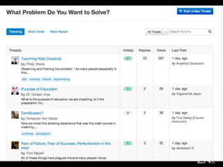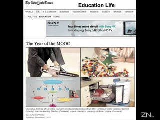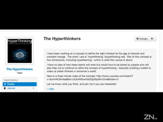 This document discusses MOOCs (Massive Online Open Courses) and hyperlearning. It introduces MOOCs as a way for learners to become self-learners through online courses from top universities. Learners are encouraged to form teams to work collaboratively on projects. The document outlines four dimensions of hyperlearning through MOOCs: becoming a self-learner, developing creative skills, accessing content easily through various media, and crowdsourcing learning through teamwork and open collaboration. Examples of popular MOOC platforms like Coursera, edX, and Udemy are provided. The conclusion emphasizes that the community experience of MOOCs is valuable for groups to self-organize and co-create through