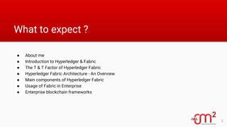 The document provides an overview of Hyperledger Fabric, a permissioned blockchain network designed for enterprise use, emphasizing its architecture, main components, and how it enforces trust without cryptocurrency or mining. It discusses the roles of key actors such as peers and orderers, the importance of channels and chaincodes, and the practical application of Fabric in various enterprise scenarios. The author, CEO Karthikeyan Sukumaran, also highlights his experience in blockchain and the benefits of utilizing Fabric in conjunction with existing enterprise processes.