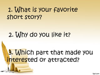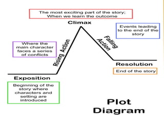 This document outlines key elements of a short story, including setting, characters, conflict, plot, and theme. It defines setting as the time and location of the story. It describes the types of characters as rounded, flat, dynamic, or static. Conflict can be between humans, nature, society, or within oneself. Plot is the sequence of events, while theme is the central idea or insight of the story.