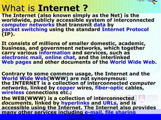 The document provides an overview of the internet, detailing its history, structure, and key services, distinguishing it from the World Wide Web. It covers various technical concepts including TCP/IP, IP addressing, network connectivity, and types of websites (static vs dynamic). Additionally, the document discusses internet protocols and the evolution of web browsers.