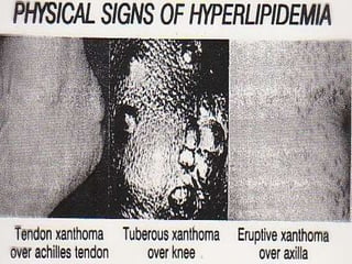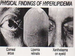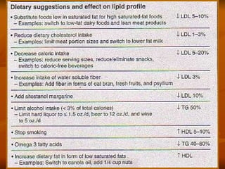 This document discusses hyperlipidemia and cholesterol. It defines important acronyms like HDL, LDL, VLDL and cholesterol levels. It lists major risk factors for high cholesterol like smoking, family history, age and obesity. It discusses therapeutic agents to treat high cholesterol like statins, fibric acids, niacin and bile acid resins. It provides an overview of their mechanisms of action, dosages and side effects. It emphasizes the importance of dietary changes like reducing fat and alcohol intake and increasing fiber for overall cholesterol management.
