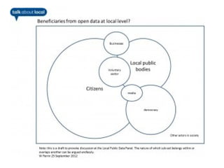 The document discusses the importance of hyperlocal and open data in the UK, highlighting various areas such as health, crime, planning, and environment where better information access can empower citizens and improve community engagement. It outlines the challenges faced by local authorities in publishing data and encourages the use of online platforms and tools to facilitate public participation and transparency. The document also mentions the potential of technology in enhancing local communication and collaboration among citizens and local councils.