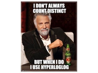 This document discusses using HyperLogLog (HLL) in Hive to efficiently estimate the number of unique elements or cardinality in big datasets. It describes how HLL provides fast approximate counting using probabilistic data structures. It covers implementing HLL as user-defined functions in Hive, comparing different open source implementations, and examples of using HLL to estimate unique visitors per day and in a rolling window.