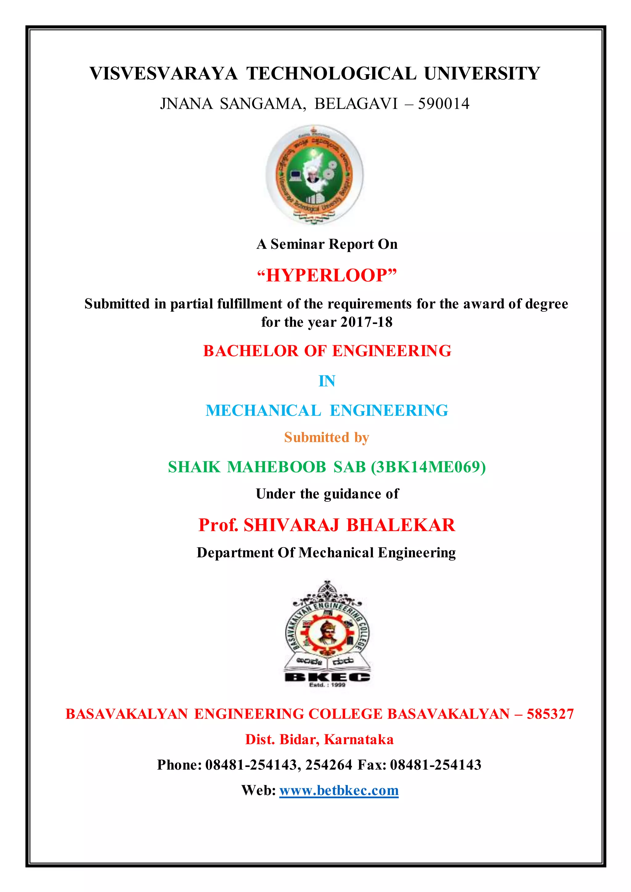 This document is a seminar report on Hyperloop submitted by Shaik Maheboob Sab to Visvesvaraya Technological University. It provides an overview of the Hyperloop system, which was first proposed by Elon Musk as a new mode of high-speed transportation. The report describes the working principle of Hyperloop, which uses a low-pressure tube and capsules that can travel at both low and high speeds through the tube while being supported on a cushion of air. It also outlines the key construction features of Hyperloop, including the tube, capsule, compressor fans, air bearings, propulsion, and suspension systems. Finally, it discusses the potential advantages and future applications of this new transportation technology.