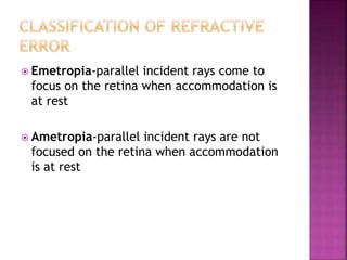 This document discusses hyperopia (farsightedness), which occurs when parallel rays of light focus behind the retina at rest. It defines different types of hyperopia such as physiological and pathological. Symptoms include eye strain, headaches, and blurred near vision. Diagnosis involves visual acuity tests, retinoscopy, and subjective refraction. Treatment options include convex lenses, contact lenses, and refractive surgery like LASIK. The prevalence of hyperopia changes with age, from high levels in infants to low levels in adults that may increase again in older age.