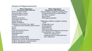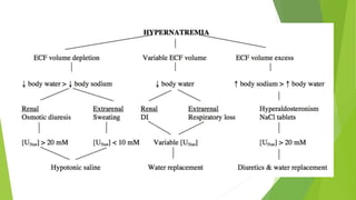 Hypernatremia is defined as a serum sodium concentration exceeding 145 mmol/L. It can be caused by hypotonic fluid deficits from renal or nonrenal losses, pure water deficits from inadequate intake or increased losses, or hypertonic sodium gains. The goals of management are to identify the underlying cause, correct any volume disturbances, and slowly correct the hypernatremia to prevent brain injury. For acute hypernatremia, the serum sodium should be decreased by 2-3 mmol/L per hour until symptoms resolve. Chronic hypernatremia should be corrected more slowly by 0.5 mmol/L per hour. The prognosis depends on factors like blood pressure, pH, and the severity and duration of hypernatrem