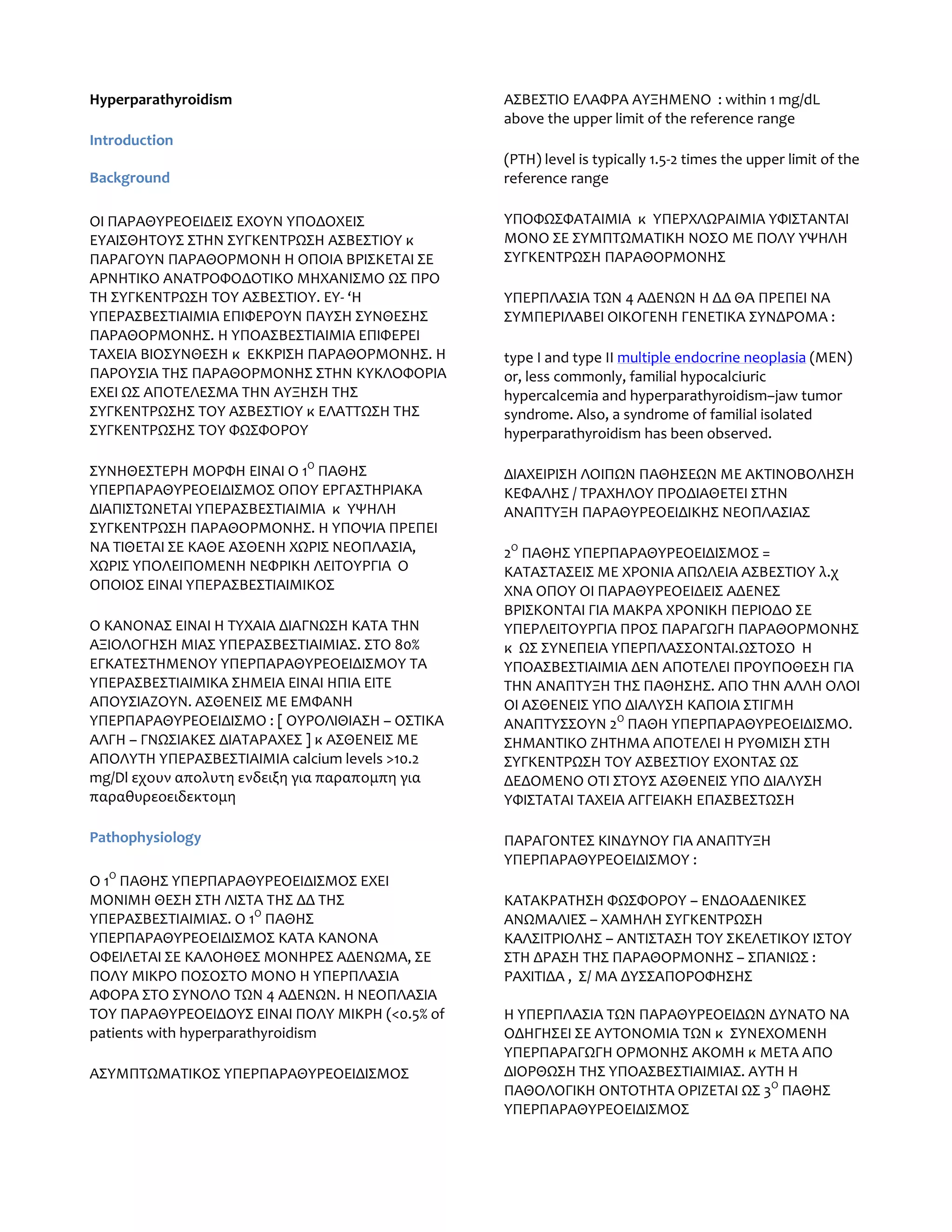 Hyperparathyroidism ΑΣΒΕΣΤΙΟ ΕΛΑΦΡΑ ΑΥΞΗΜΕΝΟ : within 1 mg/dL