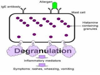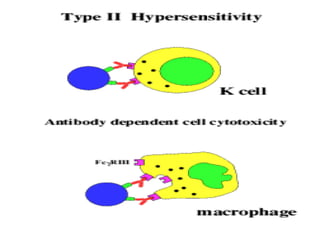 Hypersensitivity reactions are classified into four types. Type I is an immediate hypersensitivity mediated by IgE antibodies. Type II involves cytotoxic reactions against cell surfaces. Type III occurs when soluble antigens form complexes with antibodies. Type IV is a delayed hypersensitivity mediated by T cells and monocytes.