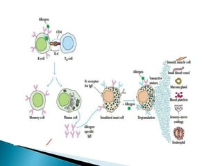 Hypersensitivity refers to an increased immune response, classified into four types: IgE-mediated (Type I), antibody-mediated (Type II), immune complex-mediated (Type III), and delayed-type hypersensitivity (Type IV). Immediate hypersensitivity occurs within 12 hours, while delayed-type hypersensitivity takes 24-48 hours, often involving T cells and cytokines. The document details the mechanisms and examples of each type, highlighting the roles of various immune cells and antibodies.