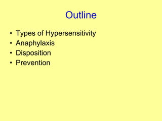 This document provides an overview of the different types of hypersensitivity reactions. It describes the pathophysiology, clinical manifestations, treatments, and examples for each of the 5 types of hypersensitivity reactions: Type I (immediate/anaphylactic), Type II (cytotoxic antibody), Type III (immune complex), Type IV (delayed-type), and Type V (stimulatory). It also provides details on the diagnosis and management of anaphylaxis, including the use of epinephrine as first-line treatment.
