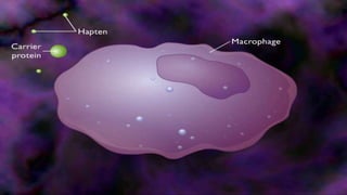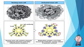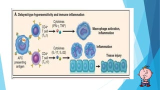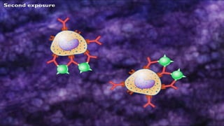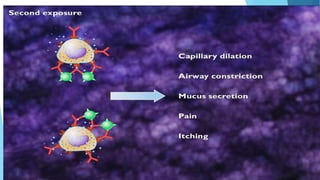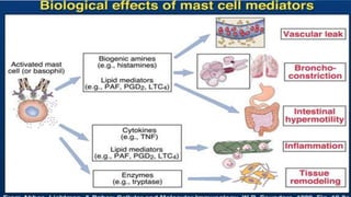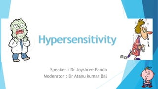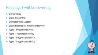 Hypersensitivity reactions are harmful immune responses that occur upon reexposure to an antigen in sensitized individuals. There are four main types of hypersensitivity: Type I is immediate and involves IgE antibodies and mast cells/basophils; Type II involves antibody-antigen interactions on cell surfaces; Type III involves immune complex deposition; Type IV is cell-mediated and delayed. The document defines key terms and outlines the mechanisms, mediators, clinical manifestations of each hypersensitivity type.