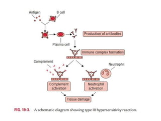 Hypersensitivity refers to undesirable immune reactions, including allergies and autoimmunity. There are four main types of hypersensitivity reactions. Type I reactions are immediate and involve IgE antibodies binding to mast cells. Type II reactions are cytotoxic and involve IgG or IgM binding to cells and tissues. Type III reactions involve immune complex deposition in tissues, activating complement and attracting neutrophils. Type IV reactions are delayed, involving sensitized T cells responding 24+ hours after antigen exposure.