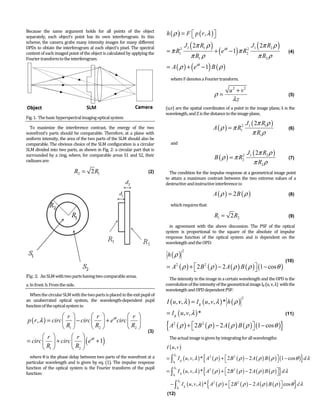 This document describes a new approach for hyperspectral imaging using wavefront division interference. The approach uses a spatial light modulator placed in the exit pupil of an imaging system to divide the wavefront from each object point into two parts with a variable phase delay. As the phase delay is changed, an interferogram is obtained for each wavelength, allowing the spectrum at each point to be determined. The approach converts a general imaging system into a hyperspectral imaging system with only a minor impact on optical performance. A prototype optical system was built to demonstrate this new wavefront division interference approach to hyperspectral imaging.