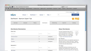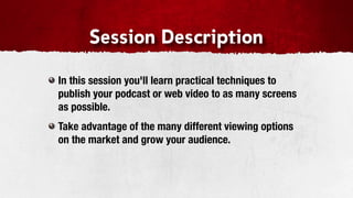 This document discusses how to publish videos to multiple platforms to reach a wider audience. It covers submitting videos to video sharing websites like YouTube and Blip.tv, creating podcasts to syndicate audio or video content through RSS feeds to portable media players and aggregators, and distributing content to televisions through devices like Apple TV, TiVo, and Windows Media Center. The document stresses the importance of branding content consistently across all platforms to grow an audience through hypersyndication.