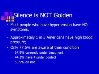 This document discusses hypertension, also known as high blood pressure. It provides key statistics on hypertension prevalence and treatment rates. Hypertension occurs when blood pressure in the arteries is high, forcing the heart to work harder. The document defines normal and abnormal blood pressure readings according to the American Heart Association. Uncontrolled hypertension can damage arteries and organs over time. Risk factors include age, race, genetics, smoking, excessive alcohol, physical inactivity, obesity, stress, salt intake, and other medical conditions. Lifestyle changes recommended to control blood pressure include quitting smoking, regular exercise, maintaining a healthy weight, eating a diet low in salt and high in fruits and vegetables, limiting alcohol, and following medical treatment if needed.