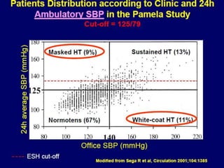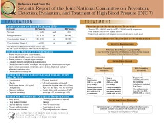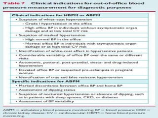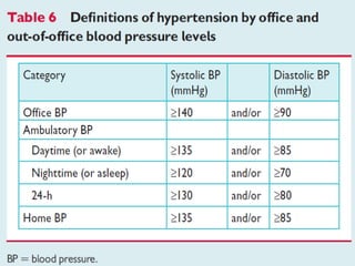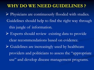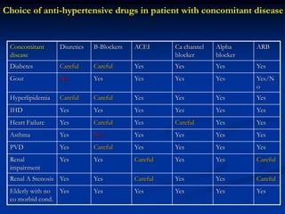 The document discusses guidelines for the treatment of hypertension. It provides a history of changes to major hypertension guidelines over time, including changes in target blood pressure levels and recommendations for first-line treatment options. It also reviews compelling indications for specific antihypertensive drug classes based on concomitant diseases or conditions. The guidelines emphasize lifestyle modifications and use of diuretics, ACE inhibitors, angiotensin receptor blockers, or calcium channel blockers as preferred initial treatment options for most patients with hypertension.