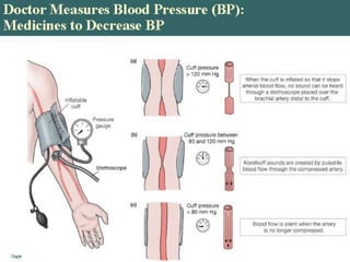 Hypertension, or high blood pressure, is defined as a systolic pressure above 140 mm Hg or a diastolic pressure above 90 mm Hg. It is a major public health problem affecting over 60 million Americans. Risk factors include family history, age, gender, ethnicity, stress, obesity, high sodium diet, and low calcium intake. Uncontrolled hypertension can lead to stroke, heart attack, and other cardiovascular diseases. Treatment involves lifestyle modifications and medication to prevent complications from this chronic condition.