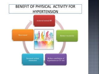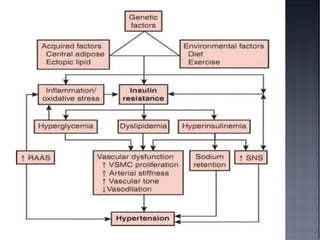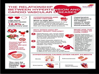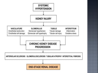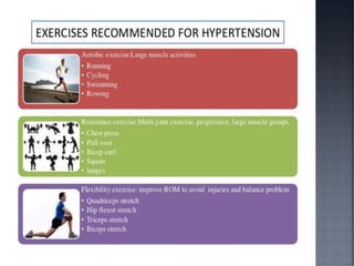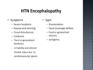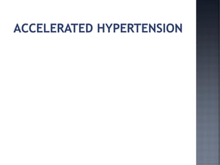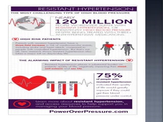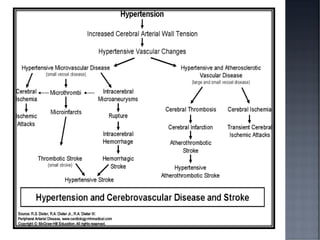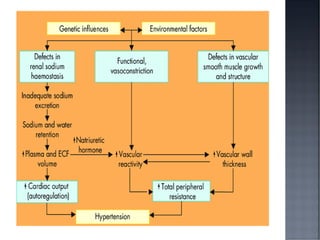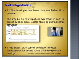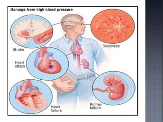 This document discusses hypertension (HTN), defining it as a persistent systolic blood pressure (SBP) of 130 mm Hg or more or diastolic blood pressure (DBP) of 80 mm Hg or more. Approximately 1.13 billion people worldwide have HTN, including 100-110 million people in India. HTN can lead to numerous complications affecting the heart, brain, kidneys and eyes if not properly managed. The document outlines assessment approaches for HTN, including medical history, physical examination, and lab tests to identify secondary causes and target organ damage from high blood pressure.