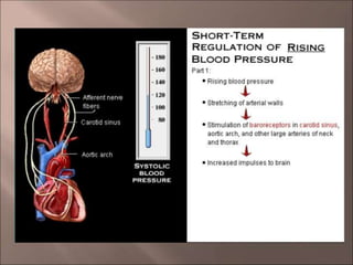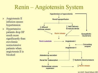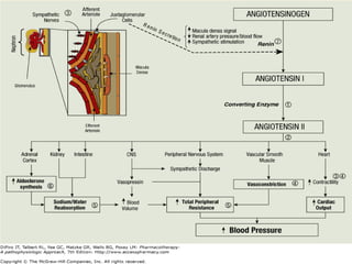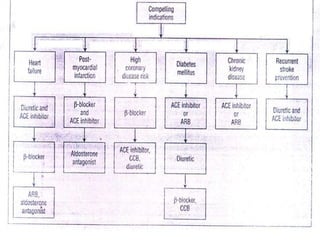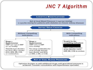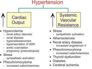 The document discusses hypertension, including its definition, classification, epidemiology, types, etiology, pathophysiology, clinical presentation, diagnosis, and management. Hypertension is defined as elevated blood pressure above 140/90 mmHg and can be essential or secondary. Common types include essential, secondary, white coat, and isolated systolic hypertension. Lifestyle modifications and medications are used to treat hypertension, with drug classes including diuretics, ACE inhibitors, ARBs, beta-blockers, calcium channel blockers, and others. The goal of treatment is to control blood pressure and reduce long term health risks.