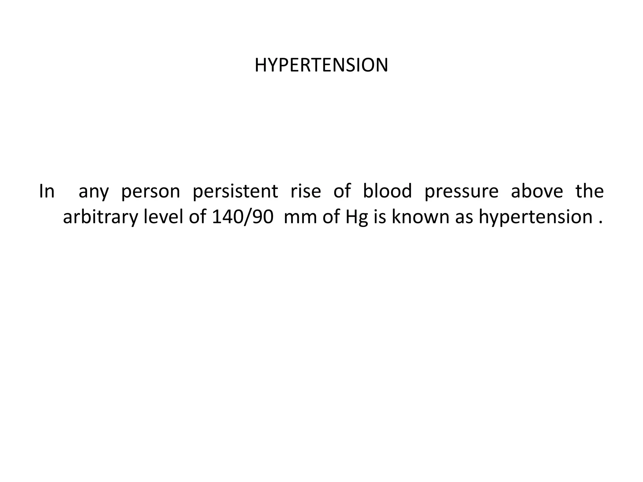 This document discusses hypertension, including its causes, mechanisms, clinical features, investigations, and treatment. It defines hypertension as a persistent blood pressure above 140/90 mm Hg. The causes are primarily essential (80-90%) or secondary (10-20%), which can be renal, endocrine, metabolic, drug-related, congenital, or psychogenic. Hypertension occurs via increased cardiac output or peripheral resistance. Clinical features involve the cerebral, cardiac, vascular, ocular, and renal systems. Investigations include urine tests, imaging, and blood tests. Treatment involves lifestyle changes and medications like diuretics, adrenergic blockers, or vasodilators. Treatment duration is typically lifelong.